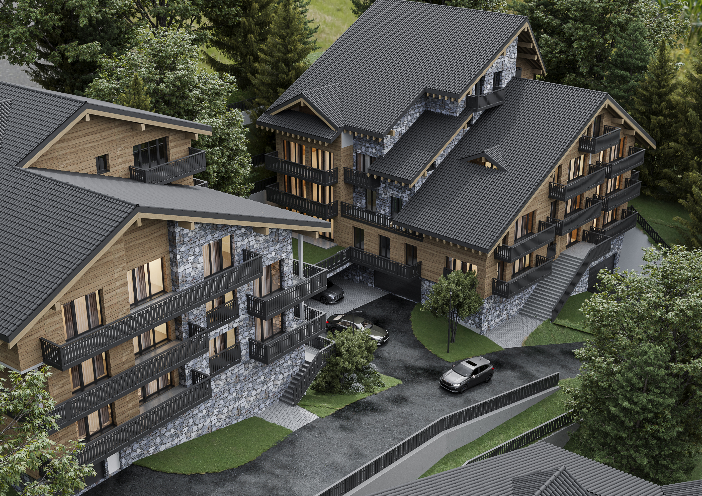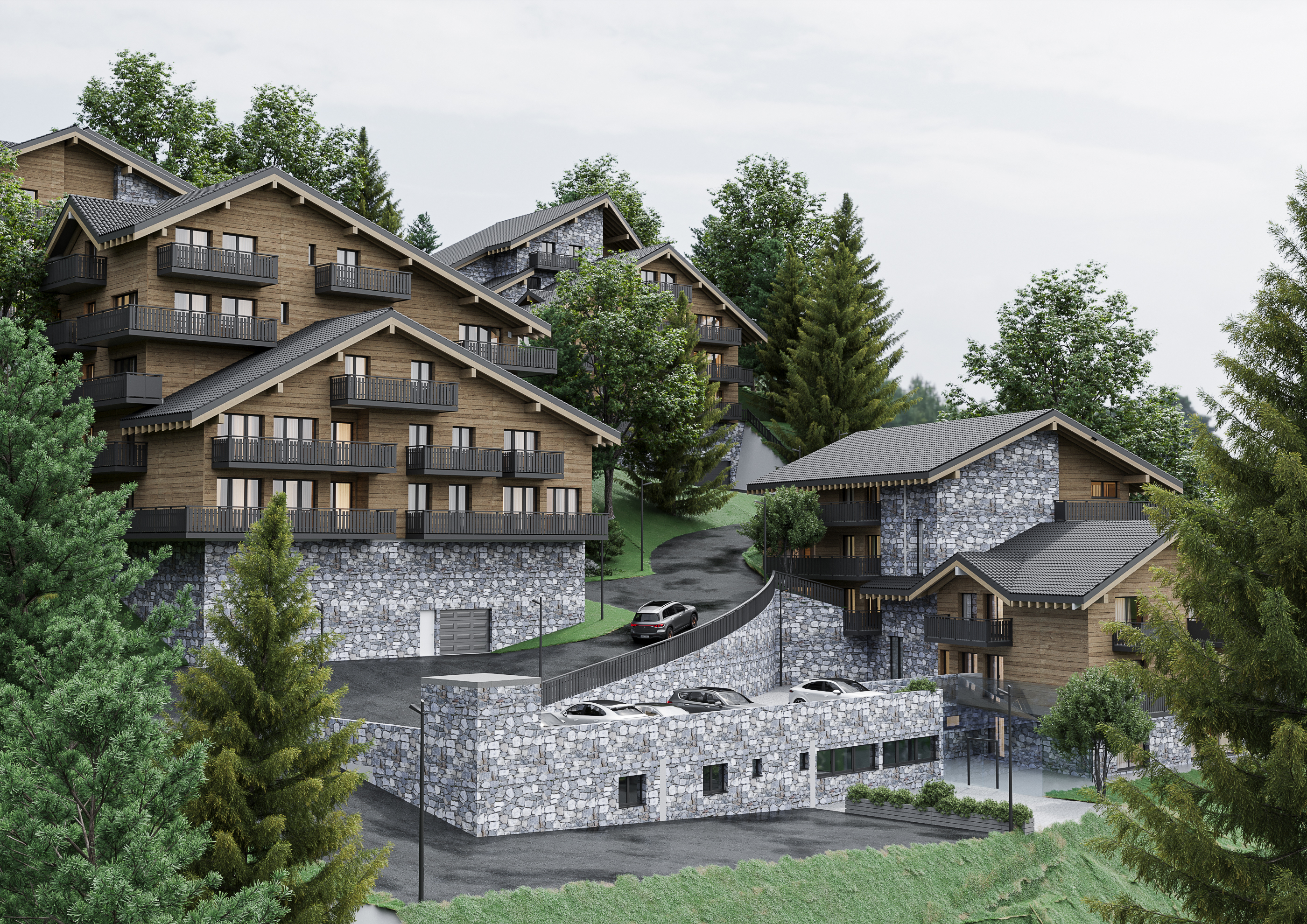 Découvrez nos chalets avec une variété d'appartements, comprenant des studios intimes, des deux pièces confortables, des trois pièces spacieux, ainsi que des quatre pièces et des cinq pièces en duplexe. Veuillez noter que les images présentées sont non contractuelles et que les images 3D peuvent différer de la réalité.